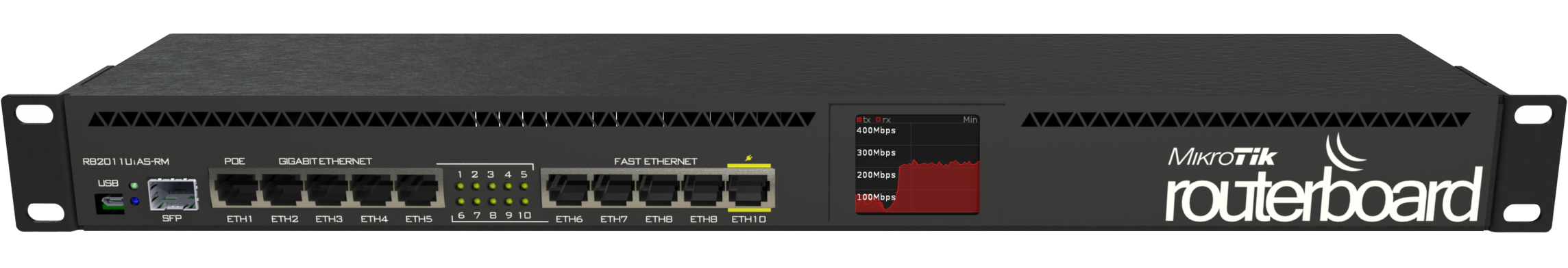 RouterBOARD 2011UiAS-RM comes with 1U rackmount enclosure, LCD panel and power supply.