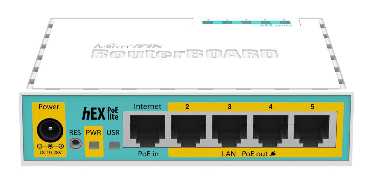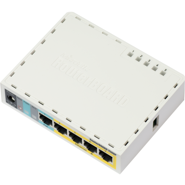 RB750UP is a small five port ethernet router in a nice plastic case, USB 2.0 port and PoE output. Ports 2-5 can power other PoE capable devices with the same voltage as applied to the unit. Less power adapters and cables to worry about! Max current is 500mA per port, Ethernet ports are shielded.