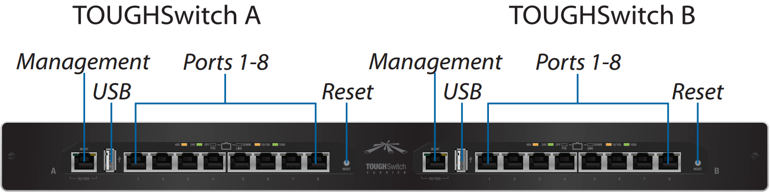 Dual TOUGHSwitch PoE Pro systems combined in a rack mount 1U form factor. 300W of power supporting up to 16 devices.