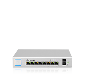 The US-8-150W UniFi Switch features eight Gigabit RJ45 ports which offer convenient different power output options: auto-sensing IEEE 802.3af/at PoE/PoE+ and 24V passive PoE, and two SFP ports provide optical fiber connectivity options to support uplinks of up to 1Gbps.